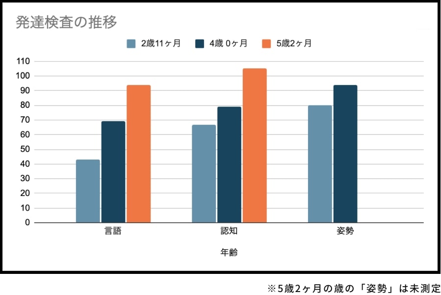 ・5歳 2ヶ月 言語94 認知105 姿勢/ 全領域 98(新版K式2020上では発達の遅れなし)
